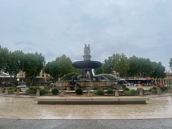 Lunch was a much-deserved Croques Madame (when is it ever undeserved?), and then it was walking time again down more of Aix’s wet streets that were lined with pastel buildings and brightly-coloured doors. Everything appeared out of a painting, owing to the effect of overcast skies on hues and texture. Stopping for tea and gelato at the farmer's market square, I eventually reached Cours Mirabeau, the famous street that Cézanne, Camus, and Zola walked - likely in better weather. I circled the Fontaine de la Rotonde, then spotted a familiar plaque on the ground nearby, then saw the statue of Cézanne before me.